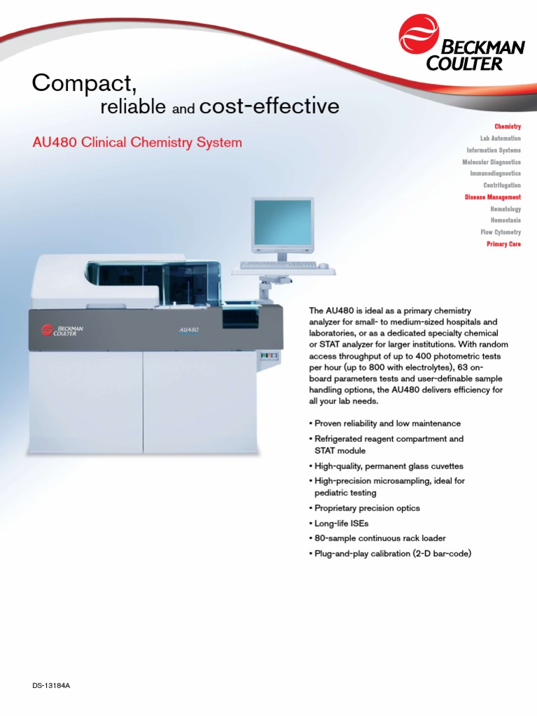 Beckman Coulter Au480 U480 Chemistry System Specification Sheet.