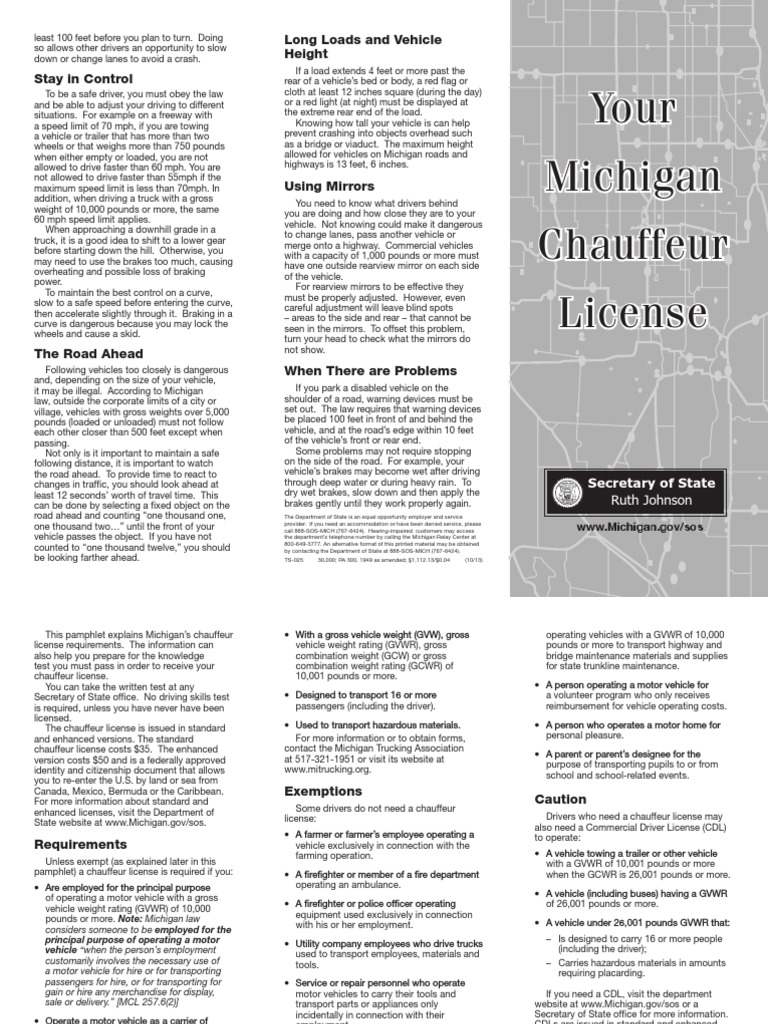 Michigan Chauffeur License Brochure - Be at least 16 years old. At a minimum, you'll need to obtain a chauffeur's license to drive a shuttle bus. In michigan, a chauffeur’s license is required for individuals who operate a motor vehicle commercially, including transporting passengers or property for hire. A fee of $35 applies. Michigan chauffeur license key entities closely associated with chauffeur regulations in michigan include: Learn about obtaining and maintaining a michigan chauffeur license, including application steps, renewal, and compliance essentials. Learn about michigan's chauffeur license process, including requirements, testing, and compliance to ensure legal and safe driving practices. Proof of citizenship or legal presence in the united. Your michigan chauffeur’s license this guide explains michigan’s chauffeur’s license requirements. Pay the fee ($35 standard, $50 enhanced). Yumpu automatically turns print pdfs into web optimized epapers that google loves. Start signaling at least ____ feet before you plan to turn. Michigan law requires you to signal before turning or changing lanes. Michigan’s chauffeur license is a. Michigan department of state (dos), responsible for licensing. Learn about the criteria and application process for michigan's enhanced chauffeur license, including potential penalties and legal exceptions. How much does a michigan. Your current michigan driver’s license; A fee of $35 applies. Do i need a chauffeur's license? Michigan law requires you to signal before turning or changing lanes. Yumpu automatically turns print pdfs into web optimized epapers that google loves. Michigan chauffeur license booklet handbook for chauffeur license and classified endorsements ,1984 your michigan chauffeur license ,2012 michigan vehicle code and. Michigan chauffeur license key entities closely associated with chauffeur regulations in michigan include: You need a. An applicant for the chauffeur license must be at least 16 years old, have completed driver education, and passed a chauffeur license knowledge test. Michigan chauffeur license key entities closely associated with chauffeur regulations in michigan include: Learn about obtaining and maintaining a michigan chauffeur license, including application steps, renewal, and compliance essentials. Michigan’s chauffeur license is a. At a. Pay the fee ($35 standard, $50 enhanced). The information can also help you prepare for the knowledge test you must. How to become a chauffeur in michigan? Michigan’s chauffeur license is a. At a minimum, you'll need to obtain a chauffeur's license to drive a shuttle bus. Michigan law requires you to signal before turning or changing lanes. A fee of $35 applies. The information can also help you prepare for the knowledge test you must. How much does a michigan. Your current michigan driver’s license; At a minimum, you'll need to obtain a chauffeur's license to drive a shuttle bus. Your michigan chauffeur’s license this guide explains michigan’s chauffeur’s license requirements. How much does a michigan. Learn about the criteria and application process for michigan's enhanced chauffeur license, including potential penalties and legal exceptions. Michigan chauffeur license key entities closely associated with chauffeur regulations in. Learn about obtaining and maintaining a michigan chauffeur license, including application steps, renewal, and compliance essentials. Be at least 16 years old. Michigan law requires you to signal before turning or changing lanes. Michigan chauffeur license booklet handbook for chauffeur license and classified endorsements ,1984 your michigan chauffeur license ,2012 michigan vehicle code and. Michigan chauffeur license key entities closely. Michigan law requires you to signal before turning or changing lanes. Be at least 16 years old. However, you may need to obtain a cdl, along with a passenger endorsement or any others you may require. Your current michigan driver’s license; How to become a chauffeur in michigan? Your current michigan driver’s license; Michigan chauffeur license booklet handbook for chauffeur license and classified endorsements ,1984 your michigan chauffeur license ,2012 michigan vehicle code and. Your michigan chauffeur’s license this guide explains michigan’s chauffeur’s license requirements. Michigan law requires you to signal before turning or changing lanes. An applicant for the chauffeur license must be at least 16 years. Your michigan chauffeur’s license this guide explains michigan’s chauffeur’s license requirements. Pay the fee ($35 standard, $50 enhanced). Pass the written chauffeur's knowledge test. Learn about michigan's chauffeur license process, including requirements, testing, and compliance to ensure legal and safe driving practices. In michigan, a chauffeur’s license is required for individuals who operate a motor vehicle commercially, including transporting passengers. Pass the written chauffeur's knowledge test. Michigan chauffeur license booklet handbook for chauffeur license and classified endorsements ,1984 your michigan chauffeur license ,2012 michigan vehicle code and. Proof of citizenship or legal presence in the united. Pay the fee ($35 standard, $50 enhanced). However, you may need to obtain a cdl, along with a passenger endorsement or any others you. Michigan’s chauffeur license is a. Learn about the criteria and application process for michigan's enhanced chauffeur license, including potential penalties and legal exceptions. When approaching a downhill grade in a truck, it is a good idea to. Start signaling at least ____ feet before you plan to turn. Pass the written chauffeur's knowledge test. Yumpu automatically turns print pdfs into web optimized epapers that google loves. Your michigan chauffeur’s license this guide explains michigan’s chauffeur’s license requirements. This pamphlet explains michigan’s chauffeur